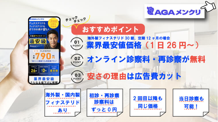 AGAメンズクリニックはAGA専門のメンズクリニックです。宣伝はSNSを中心。徹底的に広告費などの無駄を省き、AGA治療薬を業界最安水準の価格で提供。海外製のフィナステリドが12ヶ月定期プランで790円(税抜き価格)で始められます。