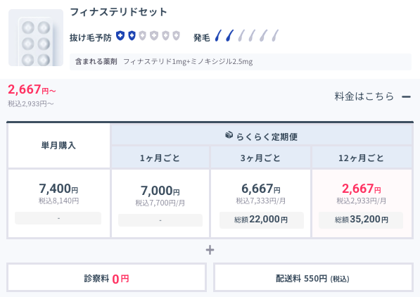 | 薄毛対策の薬 (フィナステリド) | ▼らくらく定期便12か月ごと▼ 年間で割ると 月2,097円(税込)〜 | ▼12ヶ月ごと定期配送を選択▼ 月1,349円(税込)〜 | ※1▼キャンペーン中▼ (初回1ヶ月分無料) 年間で割ると 月2,034円(税込)〜 | 月額2,200円〜 ※年間プランは ありません | ▼国産フィナステリド▼ 3,400円〜 |