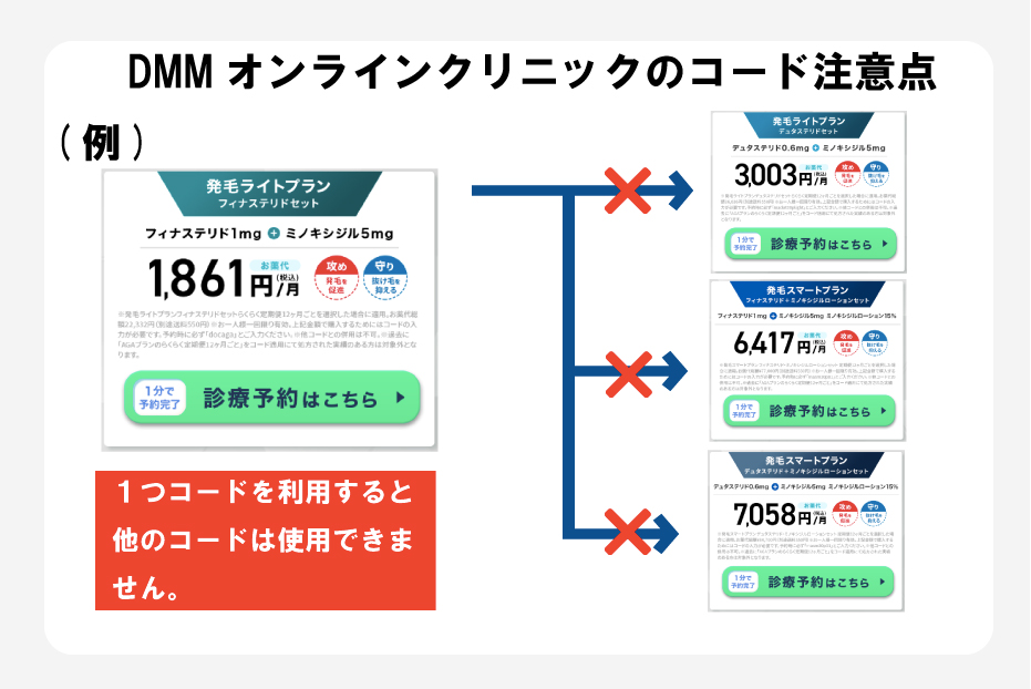 現在(2026年3月〜)DMMオンラインクリニックで発行されているコードは、1つを使用した時点で、他のクーポンコードを含めて2回目以降は利用できません。