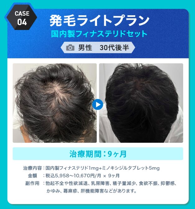 | 発毛ライトプラン (フィナステリド+ミノキシジル内服) | ![]() 月1,861円(税込) ※12ヶ月プランのコード適用価格 ※お一人様1回限り |