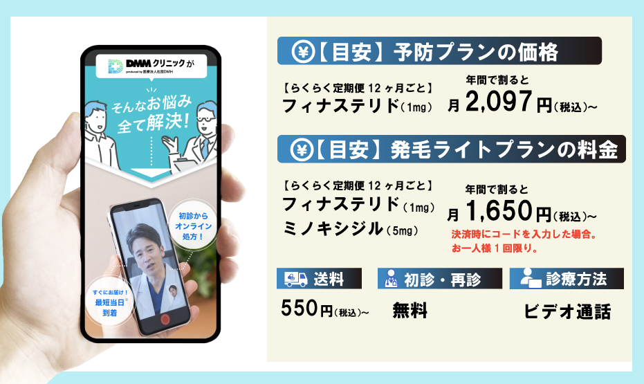 DMMオンラインクリニックでは、予防プラン(フィナステリド1mg)が2,097円(税込)〜で薄毛予防を始めることができます。