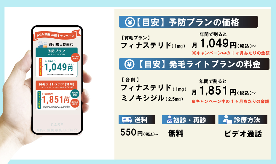 | AGA治療の価格 ※キャンペーン中の1ヶ月あたりの金額 | ※1 フィナステリド:1,049円(税込)〜 ※2 フィナステリド・ミノキシジル合剤:1,851円(税込)〜 |