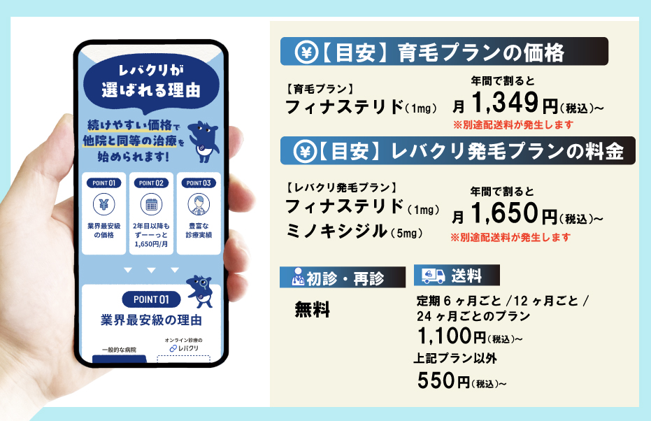 | AGA治療の価格 ※定期便12ヶ月プランの場合 | 【育毛プラン】 フィナステリド30錠/1,349円(税込)〜 【レバクリ発毛プラン】 内服薬フィナステリド1mg ・ ミノキシジル5mg/1,650円(税込)〜 |