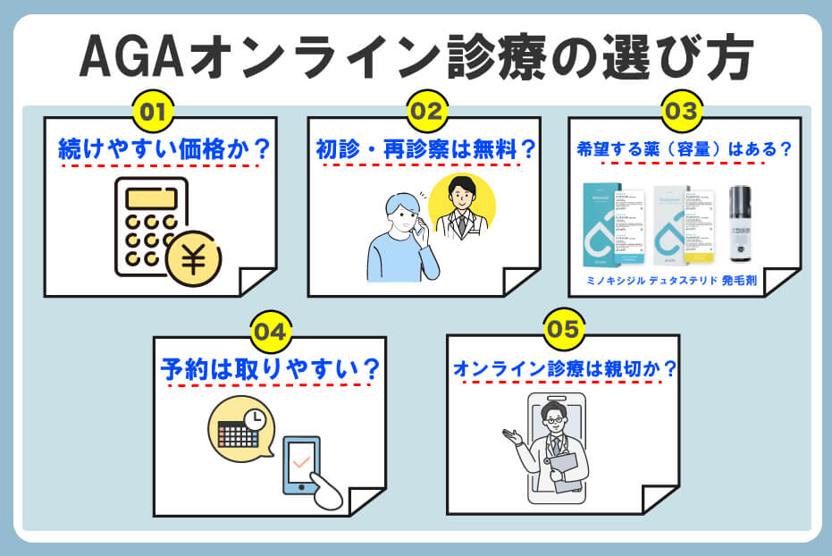 オンラインAGAクリニックを選ぶときは、この5つのポイントを押さえておくことが大切です。