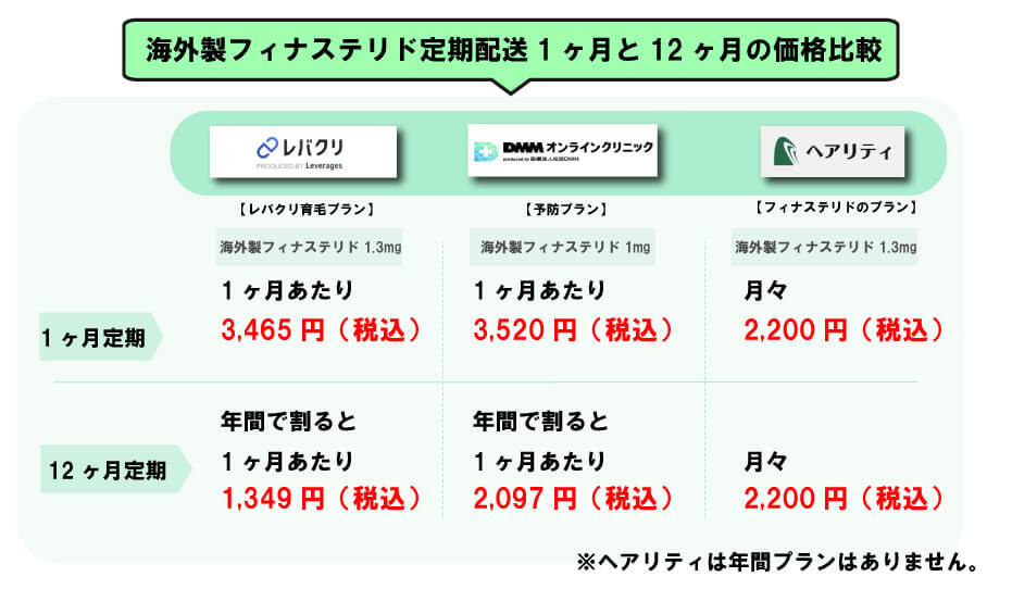 海外製のフィナステリドで比較しました。1ヶ月分から半年分まではヘアリティがお得。1年分だとフィナステリドの場合はレバクリが費用の負担が少ないです。
