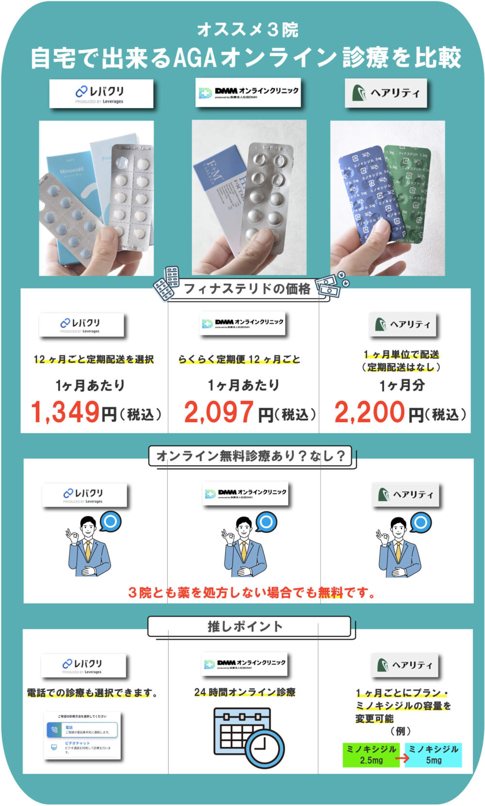 この記事では、人気のオンラインAGAクリニック「レバクリ」「DMMオンラインクリニック」「ヘアリティ」を実際に利用した私が、料金・診療内容・使いやすさなどを比較してご紹介します。