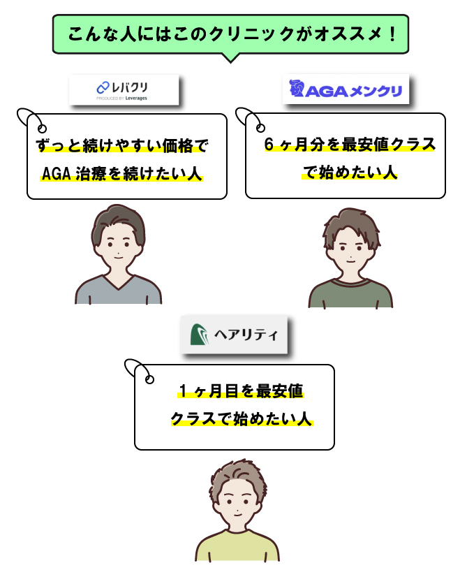 どのクリニックも、12ヶ月プランを選べば月あたり4,000円前後からAGA治療を始めることができます。