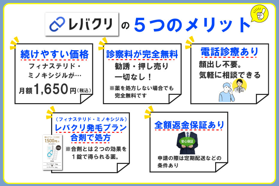 レバクリは完全オンラインで治療を始める事ができるので、通院にかかる時間や交通費がかかりません。また店舗がないため、維持費や人件費がかからず、実店舗のあるAGAクリニックよりもAGA治療が安いです。処方してもらい薬が決まっている人や継続的に安く続けたい人に向いています。