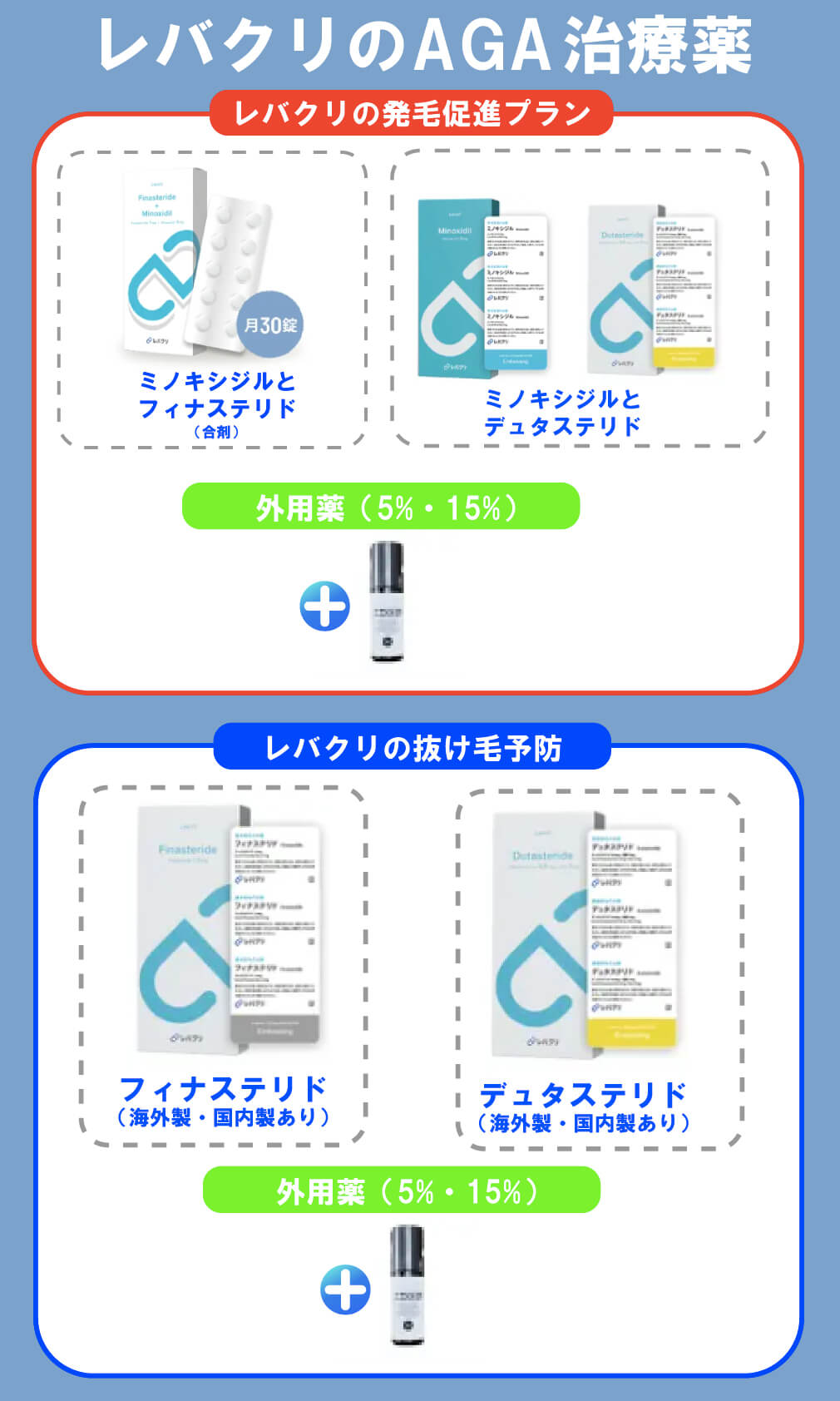 ※1レバクリの発毛プラン(フィナステリド・ミノキシジル)は、現在は合剤のみでの処方となっています。