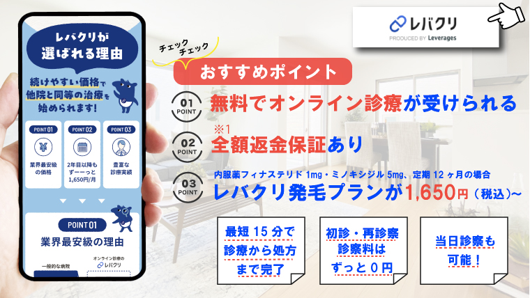 レバクリでは特別なキャンペーンはありませんが、2年目以降も同じ価格で継続でき、長期プランを選択することで継続しやすい価格になります。また診察料が薬を処方しない場合でも無料です。