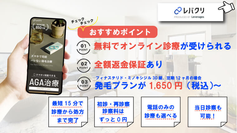 レバクリは完全オンラインで治療を始める事ができるので、通院にかかる時間や交通費がかかりません。また店舗がないため、維持費や人件費がかからず、実店舗のあるAGAクリニックよりもAGA治療が安いです。処方してもらい薬が決まっている人や継続的に安く続けたい人に向いています。