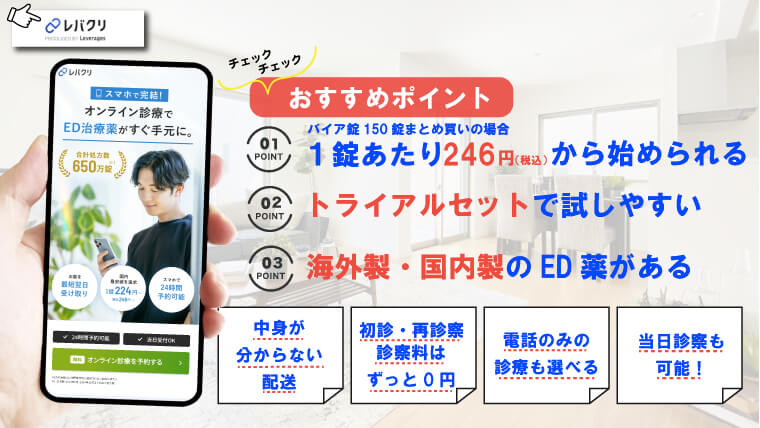レバクリでは、オンライン診療が無料で受けられるほか、3種類のED薬を試せるトライアルセットも用意されています。初めてED薬を試してみたい方におすすめのオンラインクリニックです。