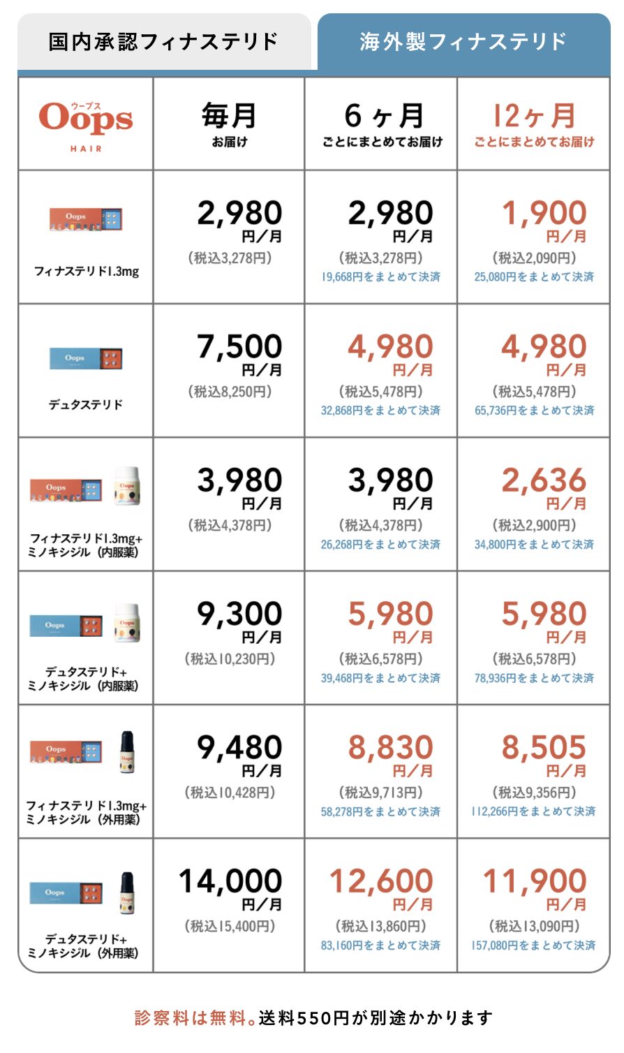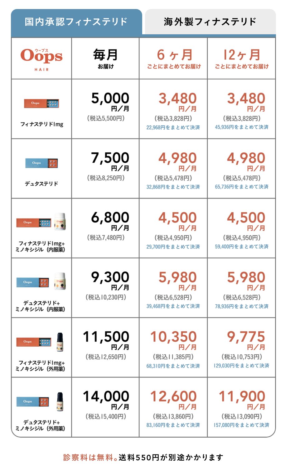 また、国内承認薬のフィナステリドは、6ヶ月プランと12ヶ月プランで月あたりの価格が同じに設定されています。