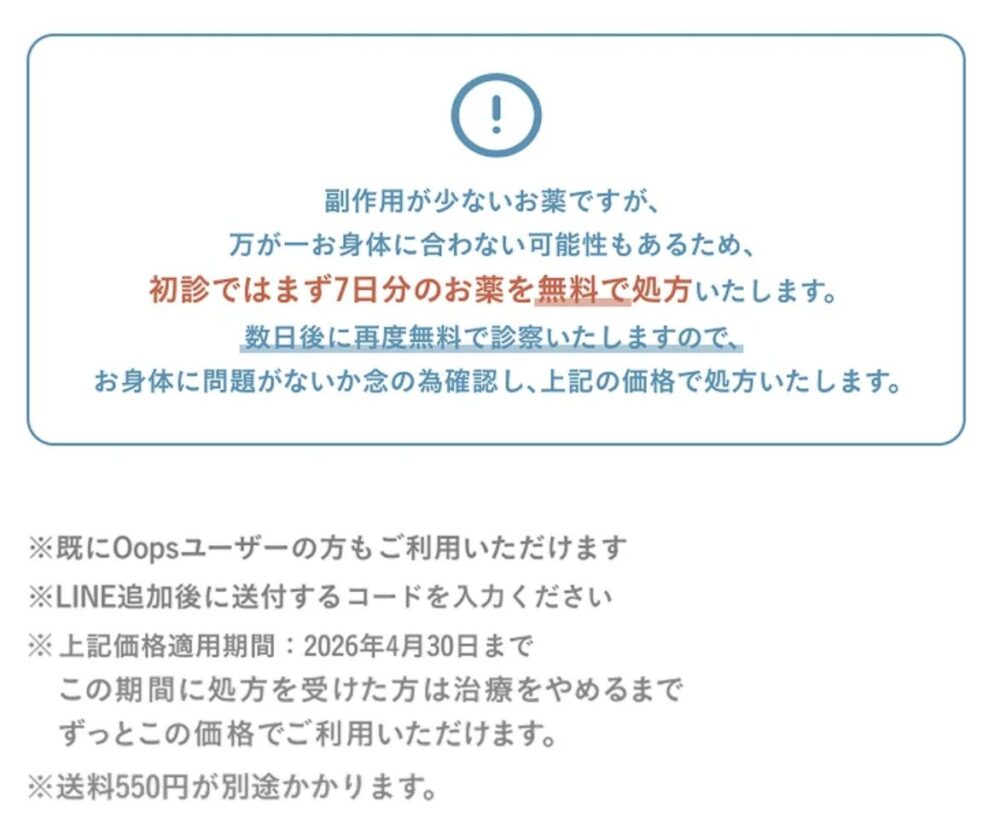 Oops HAIR(ウープス ヘア)ではフィナステリドは初診では7日分のお薬を無料で処方してくれます。