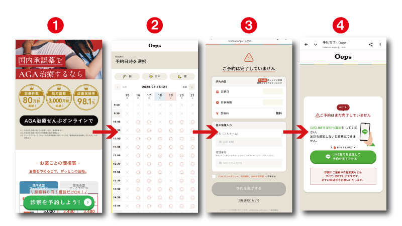 Oops HAIR(ウープス ヘア)の予約方法は公式ページから予約日時を選択し、基本情報を入力。その後にLINE友達追加をして、LINE上にお知らせやオンライン診療ページの案内が届く流れです。