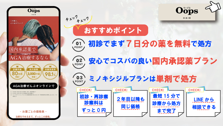 Oops HAIR(ウープス ヘア)のメリットは次の4つです。特に無料のオンライン診療や継続しやすい価格で、AGA薬が初めての人やAGAクリニックの乗り換え先を検討している人にもオススメです。