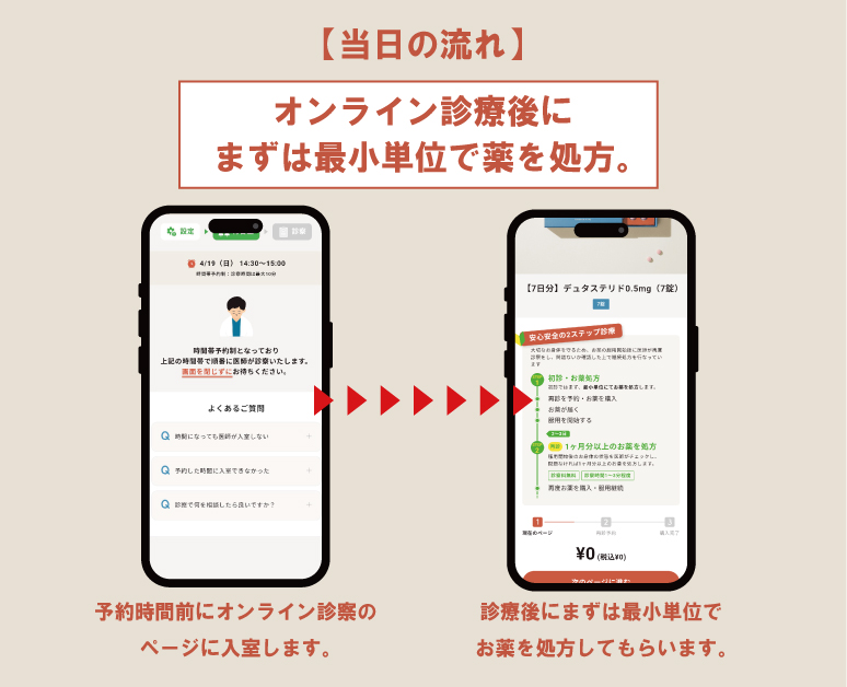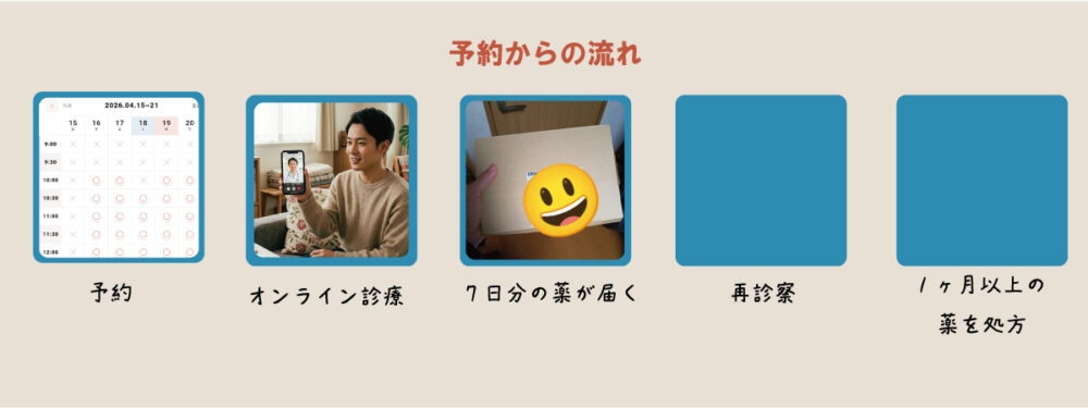 実際に、予約から診療を受けた後、最初に1週間分の薬が届きます。そこで体調や副作用の有無を確認したうえで、問題なければ1ヶ月以上の薬を継続処方してもらえる流れです。