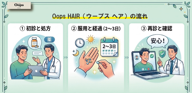 Oops HAIR(ウープス ヘア)では処方された薬を2〜3日後に服用してから再度診察する必要があります。初めての薬や副作用が心配な方には安心して利用できます。
