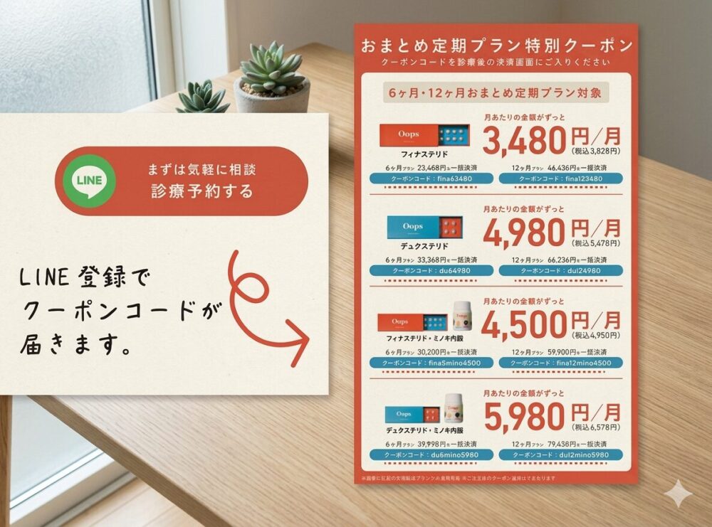 Oops HAIR(ウープス ヘア)ではLINE登録するとAGA薬プランがお得になるクーポンコードが発行されます。