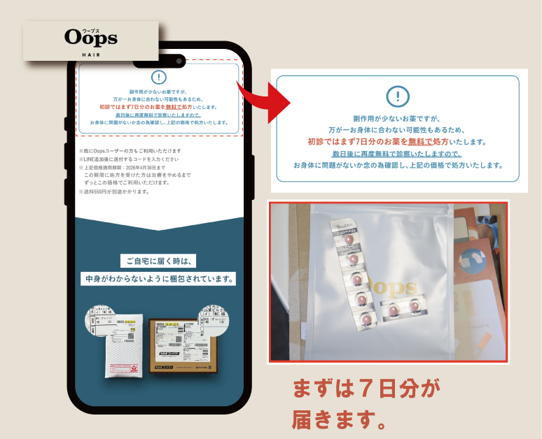 Oops HAIR(ウープス ヘア)では、初めての方でも安心して始められるよう、まずは7日分無料で処方し、まずは「身体に合うかどうか」を確認する期間を設けています。