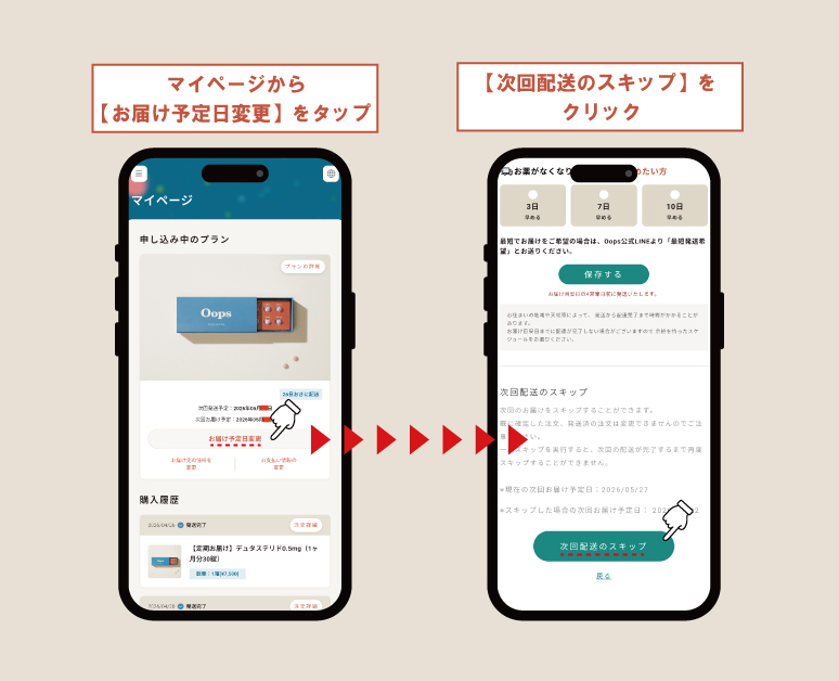 薬が余ってしまった場合や様子を見たい場合は配送を「マイページ」から配送をスキップすることができます。